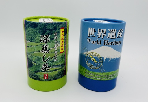 「世界農業遺産 茶草場農法」 または 「世界遺産 富士山」 の風景写真を使用した紙缶でのお届けです。(ネコポス便は袋入り)
