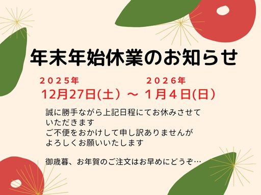 年末年始休業のお知らせ 2025.12.01 ショップからのお知らせ 日頃より当組合のお茶をご愛飲頂き誠にありがとうございます。 2025年12月27日(土)~2026年1月4日(日)は、冬季休業とさせていただきます。 FAX,インターネットからのご注文は24時間受け付けておりますが、発送までお時間をいただくことがありますので、早目のご注文をお願いいたします。 ご不便をお掛けし申し訳ありませんが、ご理解のほどよろしくお願い申し上げます。