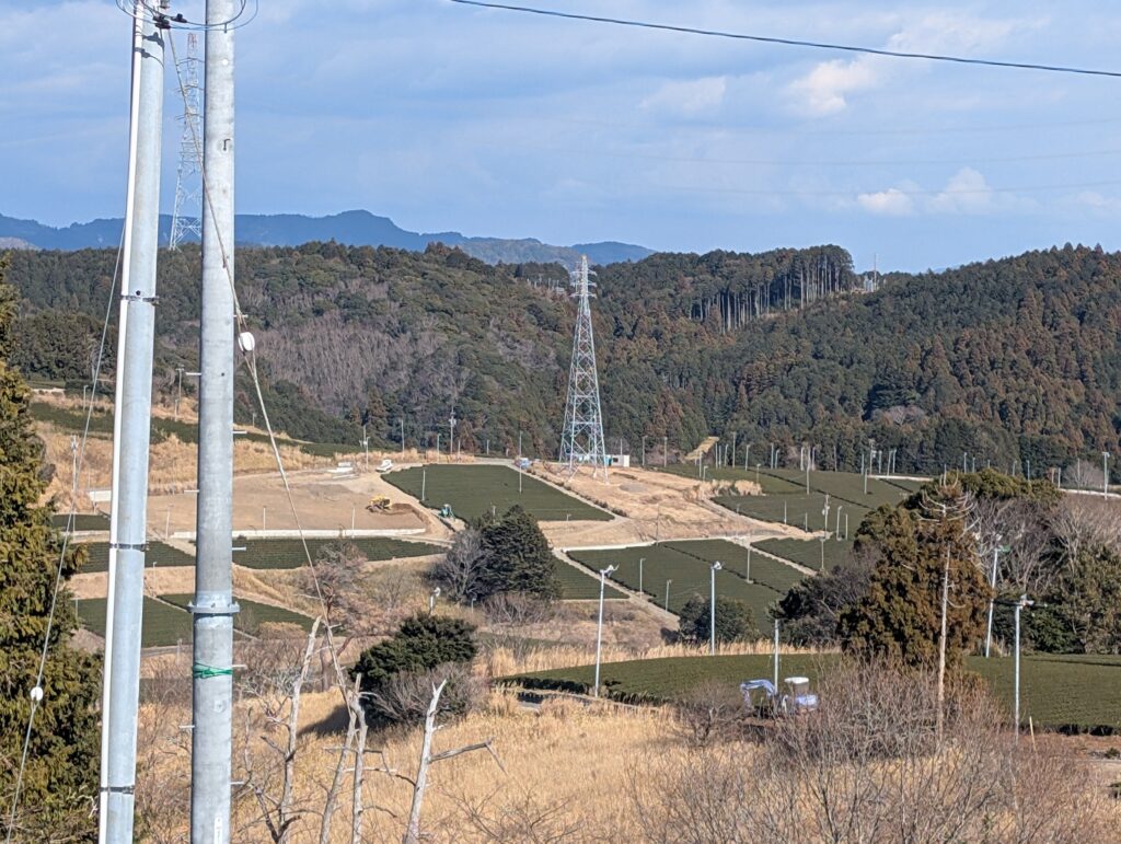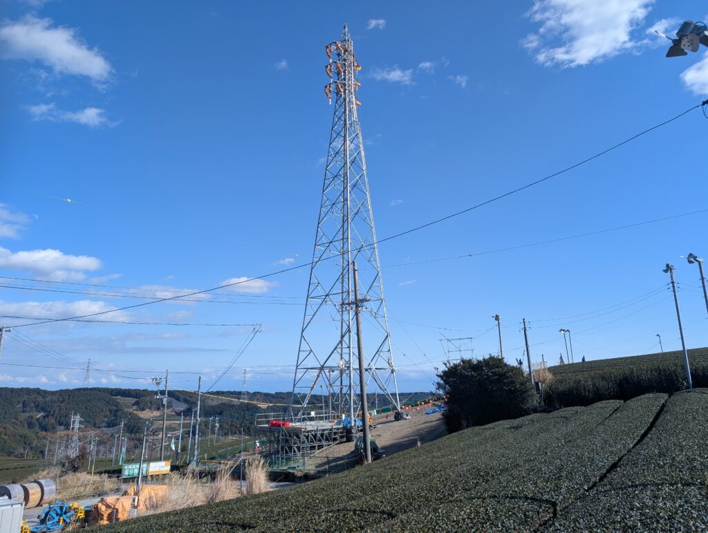 そのため、周辺では定期的に鉄塔の更新や補強工事が行われます。 今回の建て替えも、地域の電力を安定して届けるための 大切なメンテナンス作業のひとつです。 茶畑のすぐ脇で工事が進んでいるのも、 この変電所が近いからこそ見られる光景です。