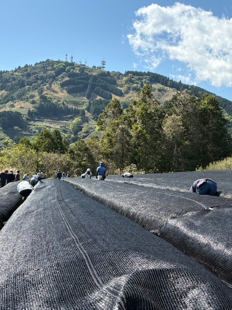 新茶の季節が近づくと、東山の茶畑では「被覆作業」が始まります。 黒いネットを広げ、丁寧に畝(うね)にかけていくこの作業は、やわらかい香りと深い旨みを引き出すために欠かせない大切な工程です。